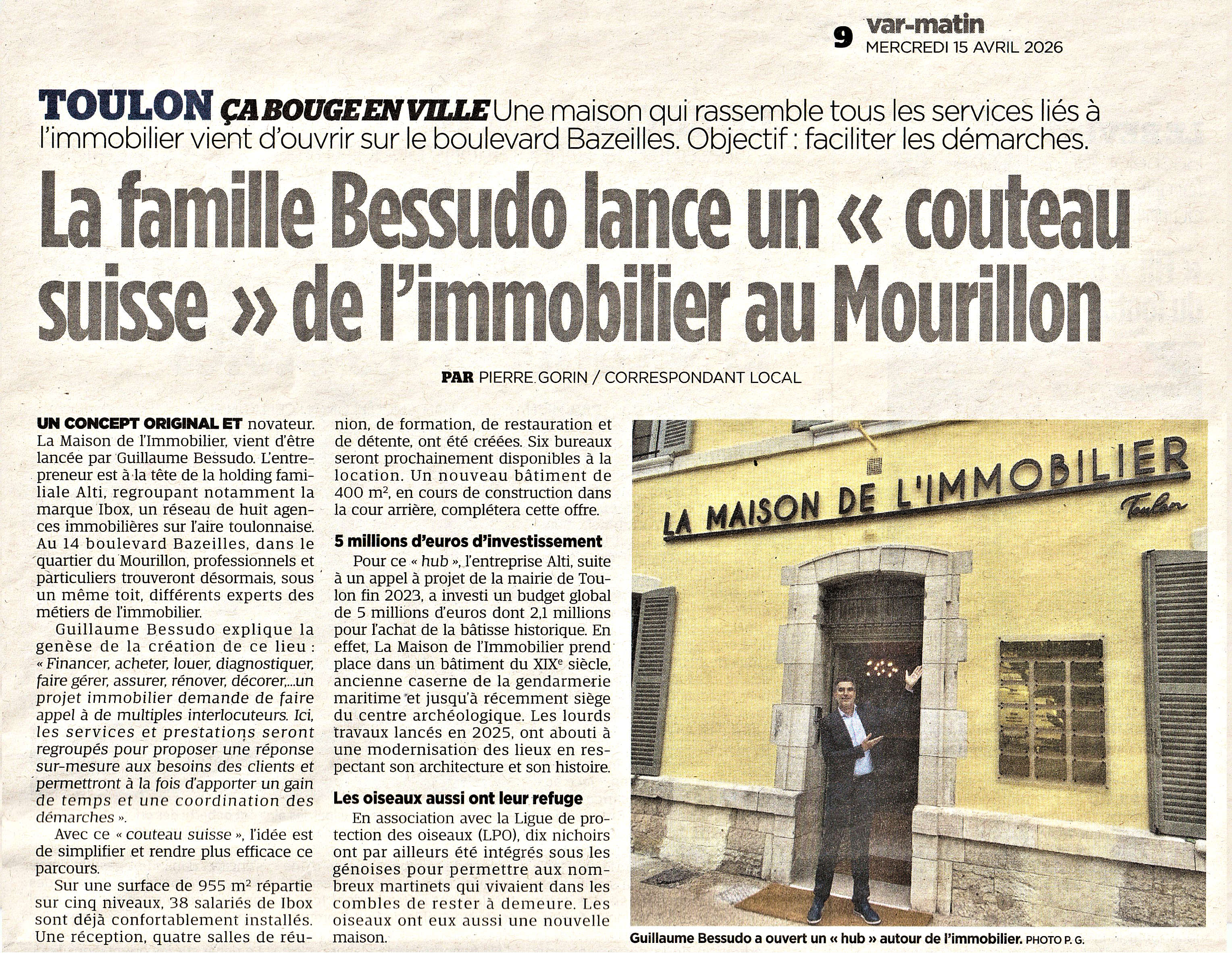 L’entrepreneur est à la tête de la holding familiale Alti, regroupant notamment la marque Ibox, un réseau de huit agences immobilières sur l’aire toulonnaise’. Au 14 boulevard Bazeilles, dans le quartier du Mourillon, professionnels et particuliers trouveront désormais, sous un même toit, différents experts des métiers de l’immobilier.